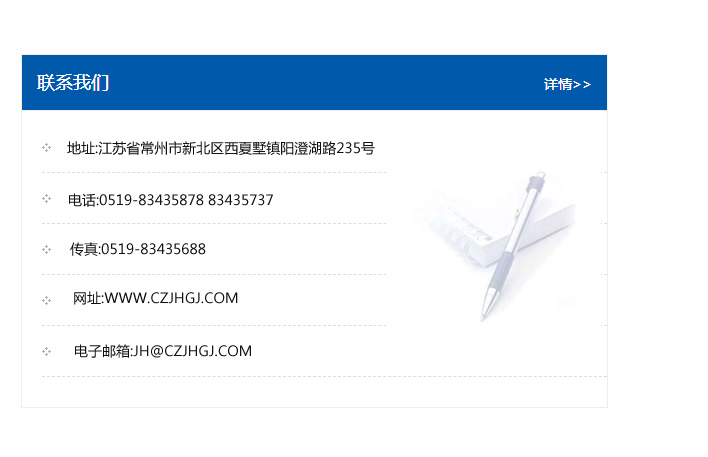 傳真:0519-83435688    郵編:213135    網址:WWW.czjhgj_com.020curtain.com    電子郵箱:JH@czjhgj_com.020curtain.com